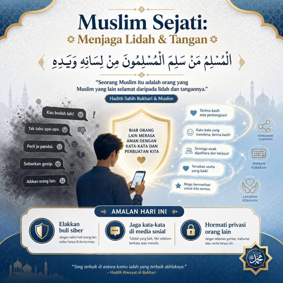 “Seorang Muslim yang sejati ialah orang yang kaum Muslimin lain selamat daripada gangguan lidah dan tangannya.”