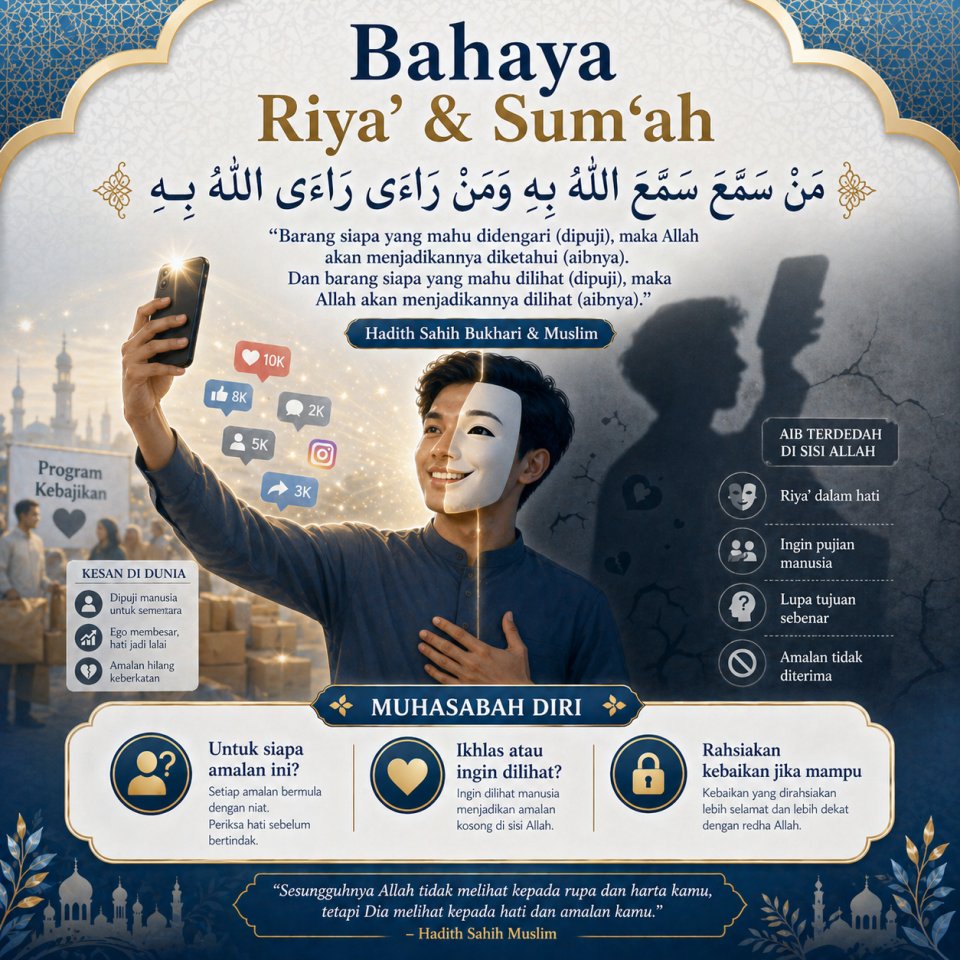 Amalan yang Lebih Selamat: Utamakan melakukan kebaikan secara tersembunyi. Jika ingin berkongsi, pastikan tujuannya adalah untuk memberi manfaat dan bukan untuk menonjolkan diri sendiri.