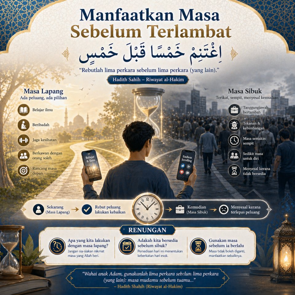 **“Rebutlah lima perkara sebelum datang lima perkara: masa mudamu sebelum masa tuamu, sihatmu sebelum sakitmu, kayamu sebelum miskinmu, waktu lapangmu sebelum sibukmu, dan hidupmu sebelum ...