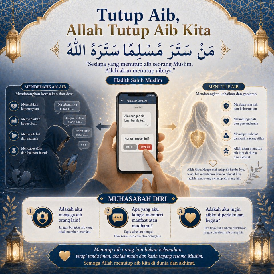 Apa yang kita harapkan daripada orang lain terhadap diri kita — itulah yang sepatutnya kita lakukan kepada mereka. Setiap manusia mempunyai aib yang ingin dilindungi, maka jagalah aib orang lain sebagaimana kita ingin aib kita dijaga.