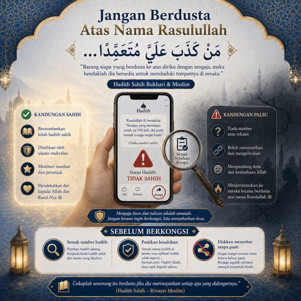 Penyebaran ilmu agama adalah satu amanah yang besar. Setiap perkataan yang disandarkan kepada Rasulullah SAW mesti dipastikan kebenarannya. Sikap berhati-hati dalam berkongsi adalah tanda keimanan dan tanggungjawab seorang Muslim.