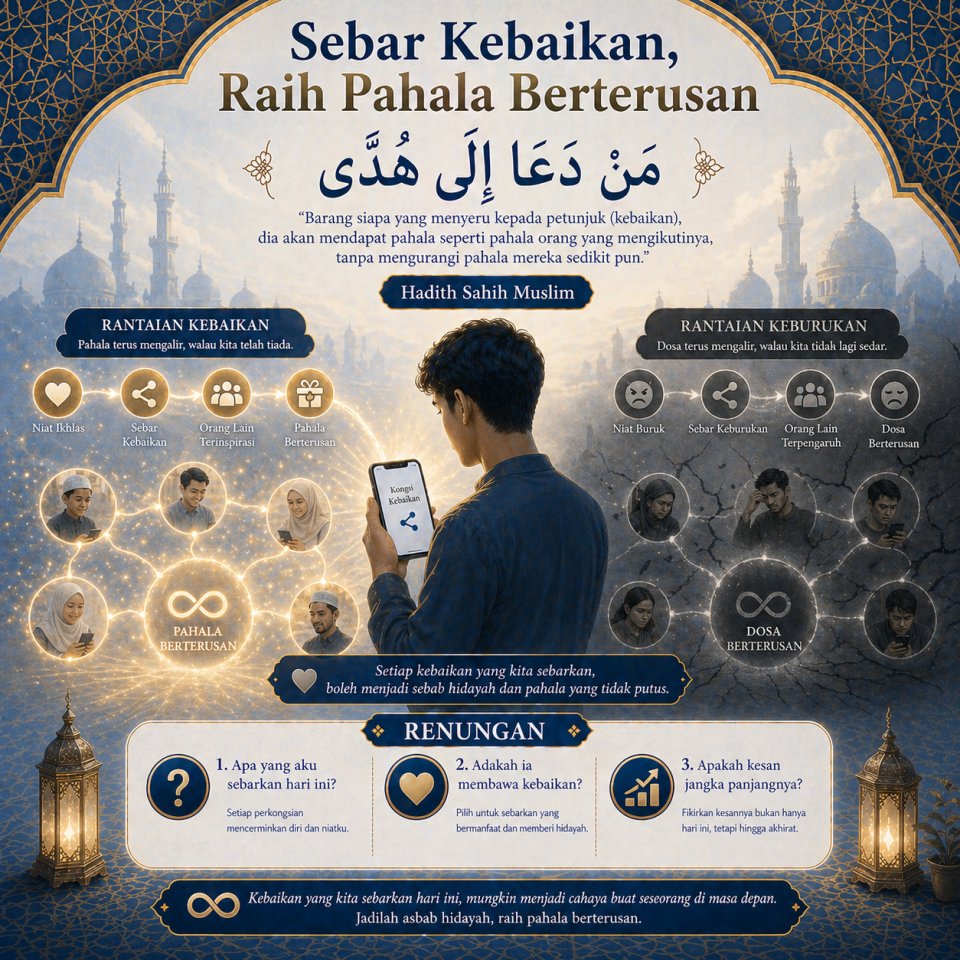 Setiap perkongsian di dunia digital bukan sekadar tindakan biasa, tetapi satu peluang untuk mengumpul pahala yang berterusan. Gunakan platform yang ada untuk menyebarkan kebaikan dan meninggalkan legasi yang memberi manfaat kepada orang lain.