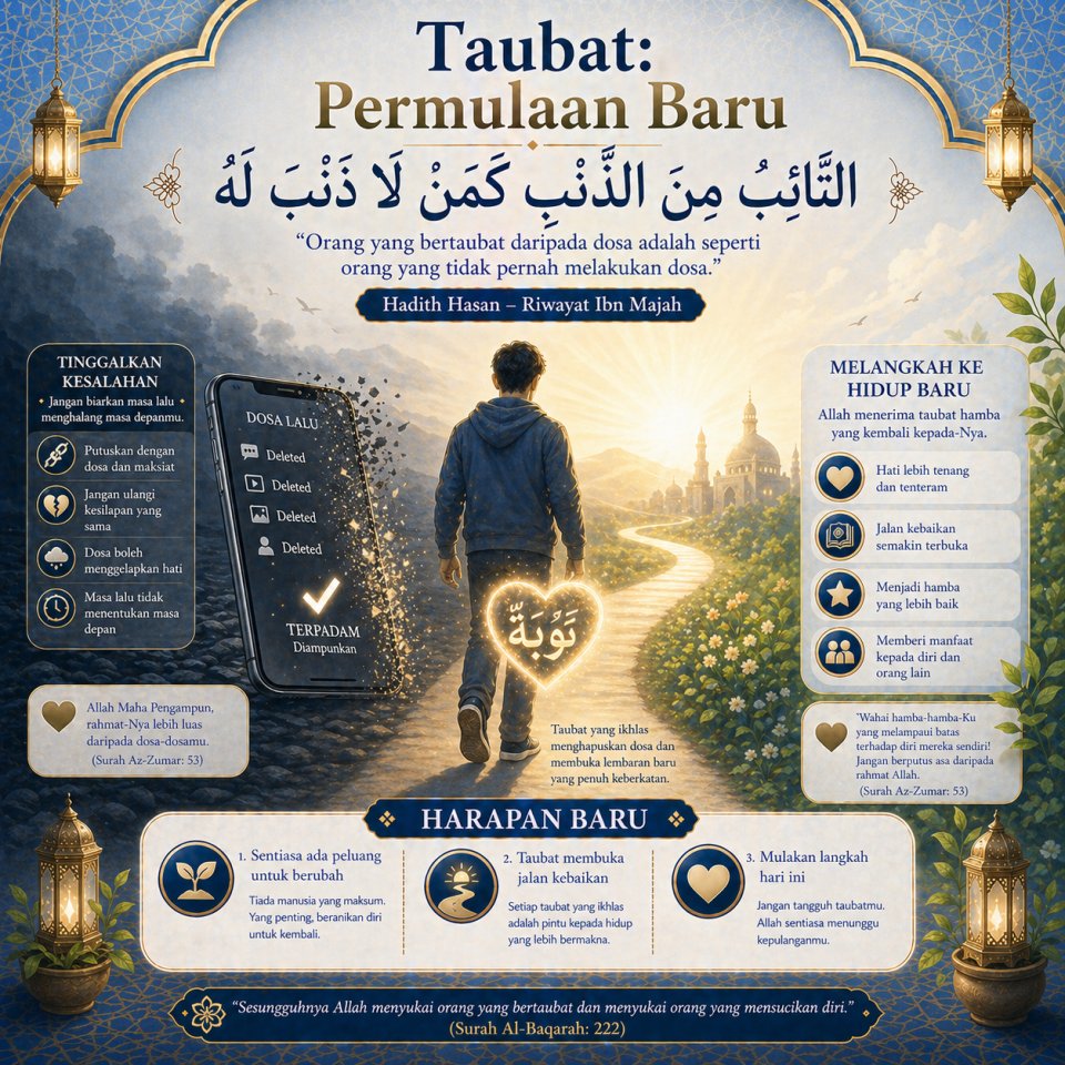 Taubat adalah peluang besar yang diberikan oleh Allah SWT kepada hamba-Nya untuk kembali kepada jalan yang benar. Setiap individu mempunyai kesempatan untuk memperbaharui diri dan membina kehidupan yang lebih baik dengan penuh harapan dan keimanan.
