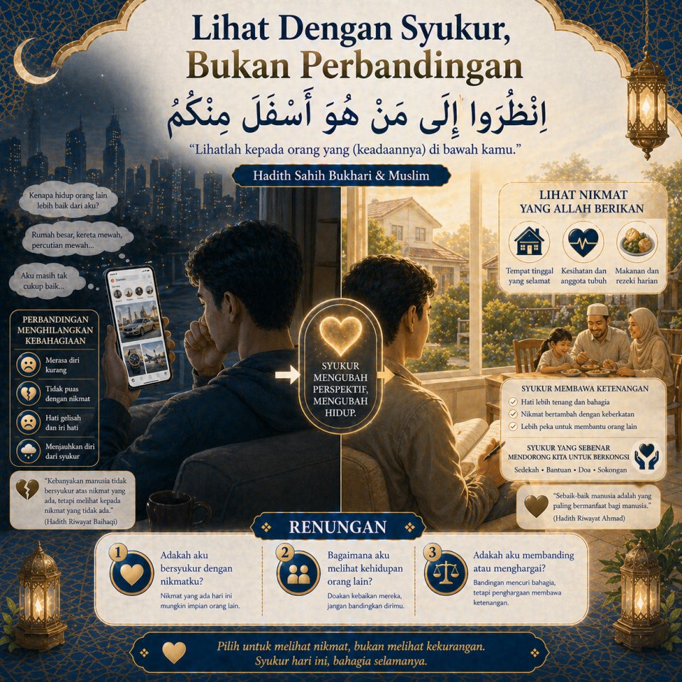 Membina Perspektif yang Seimbang: Selain melihat kejayaan orang lain, penting untuk menyedari realiti kehidupan mereka yang kurang bernasib baik agar hati lebih bersyukur.